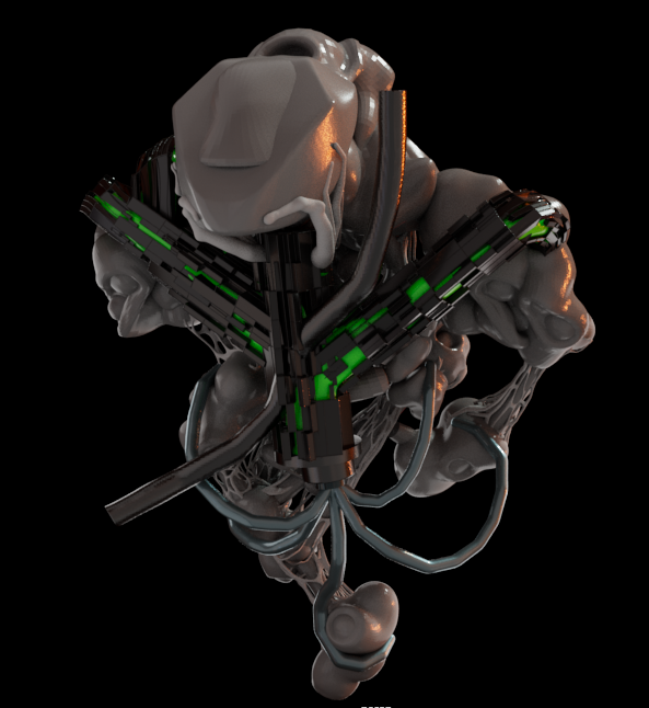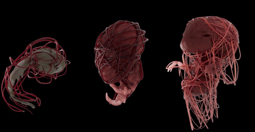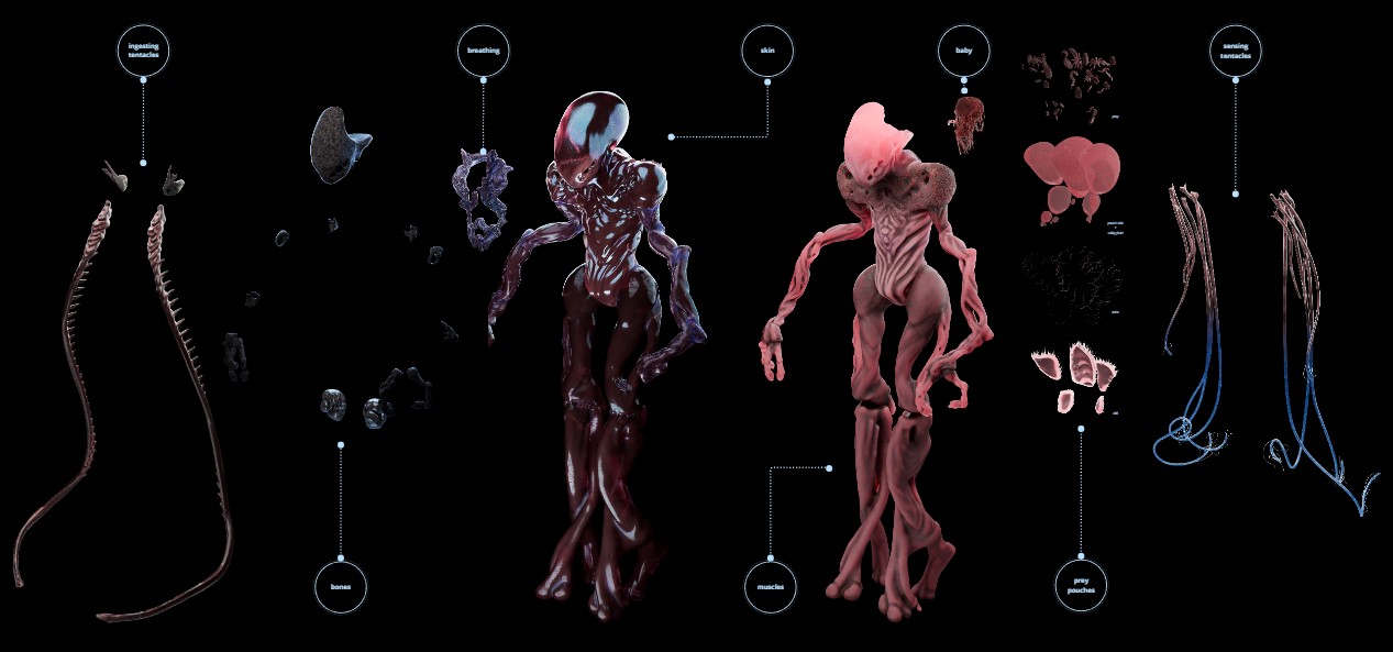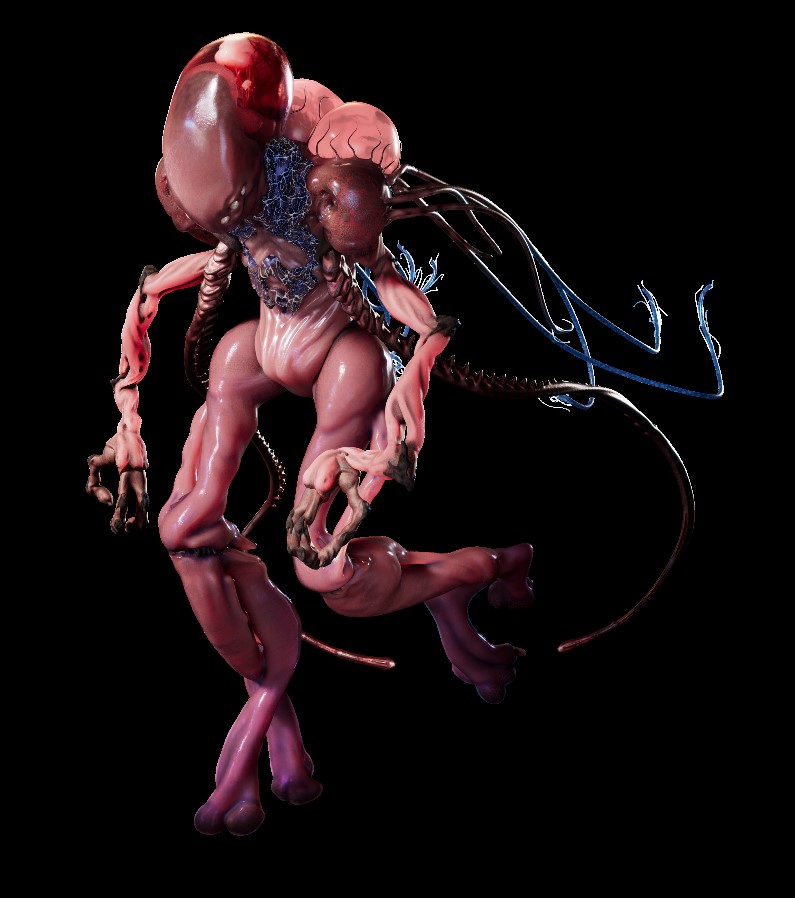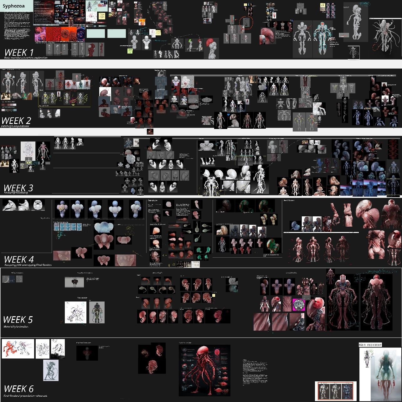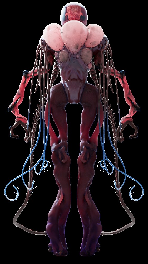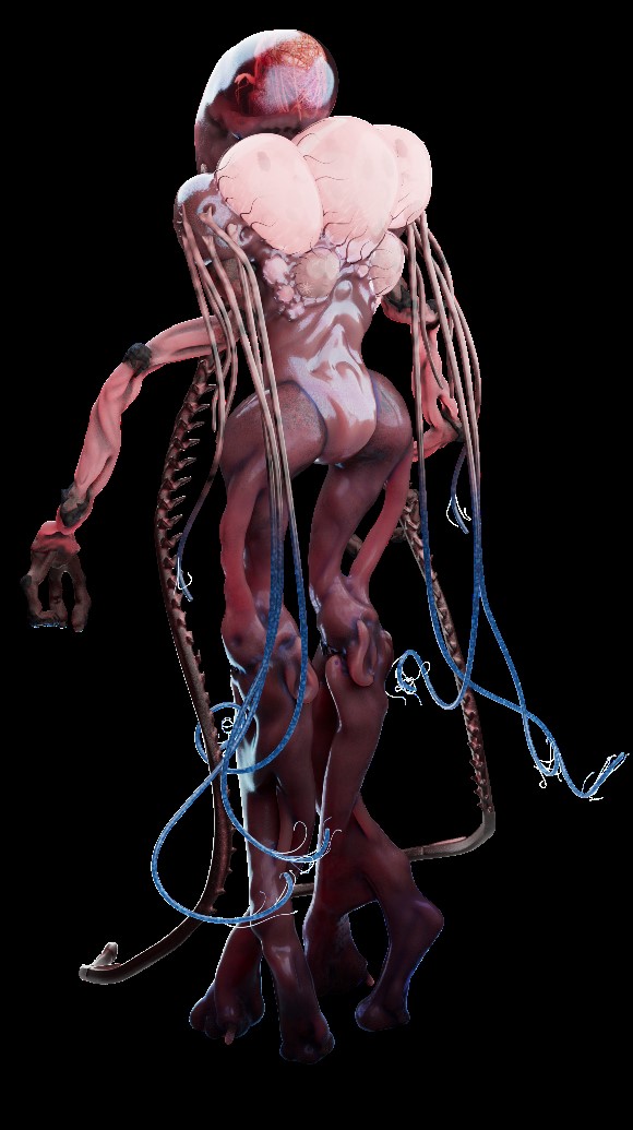 As I modeled and textured the offspring growth of the main character Syphozoa, each stage unfolded with wire-like connections and emerging limbs, casting a chilling aura of unnatural progression. Throughout this eerie metamorphosis, the creature's emotional maturity advanced at a disconcertingly rapid pace compared to its physical development, suggesting a mysterious and unsettling narrative behind its transformation.