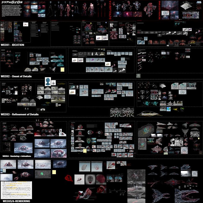 Over six weeks, my team and I developed the Syphozoa character in stages: baseform concept, detailed modeling, UV unwrapping and texturing, and finally lighting and rendering. Throughout this process, I received valuable feedback from instructors Nicolas Turchi (Computational Lead and Assistant Professor in Advanced Digital Design at Manchester School of Architecture), Aleksander Bursac (Designer at Heatherwick Studio), and Maria Soroko-Tsyupa (Computational Designer).
