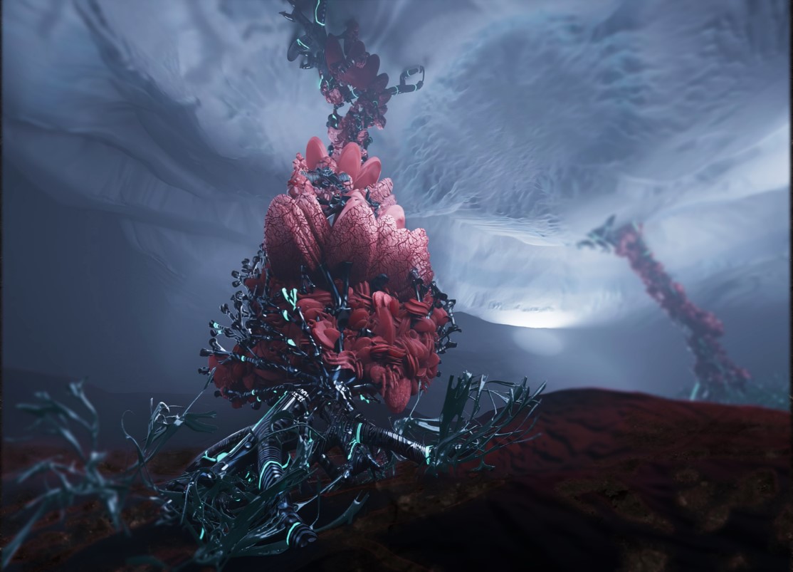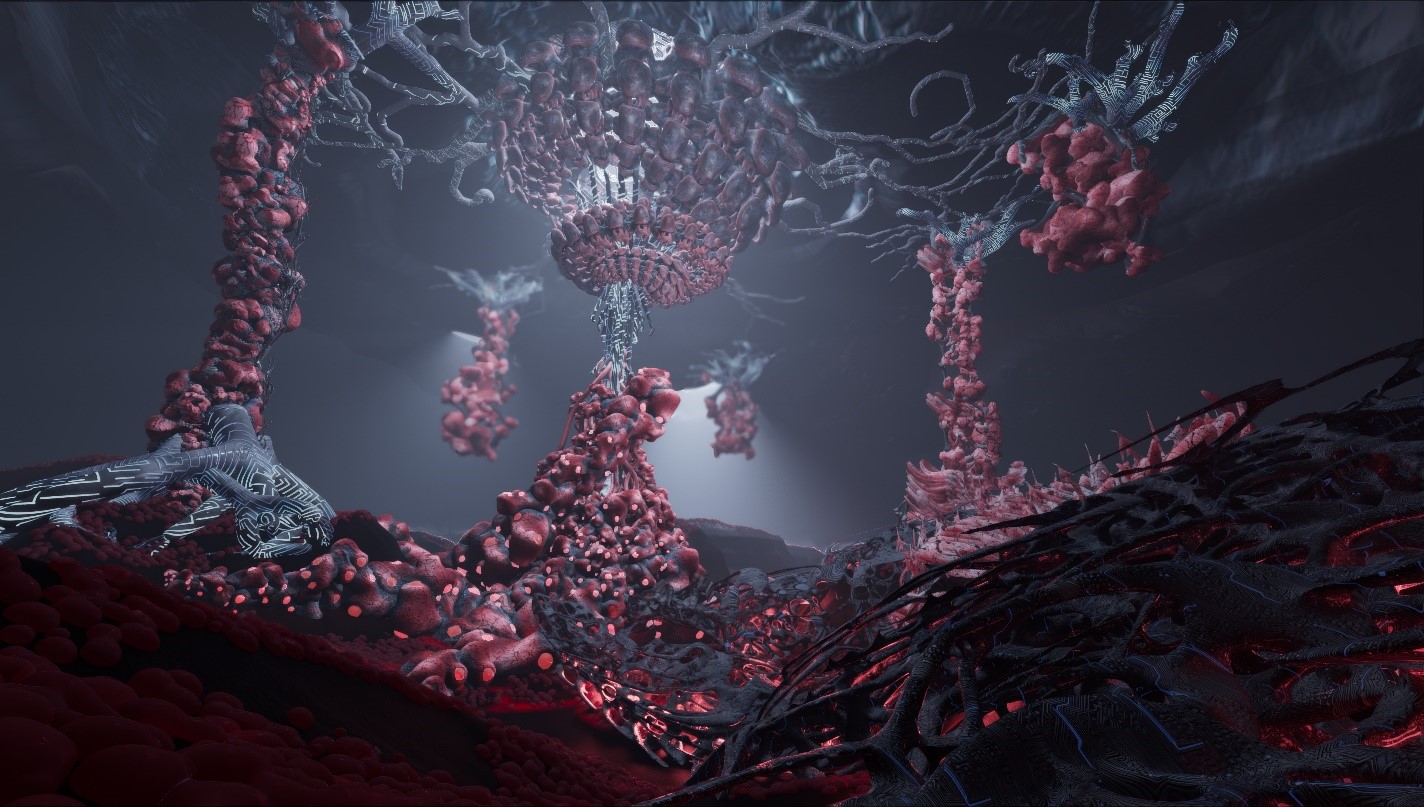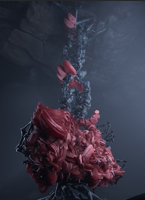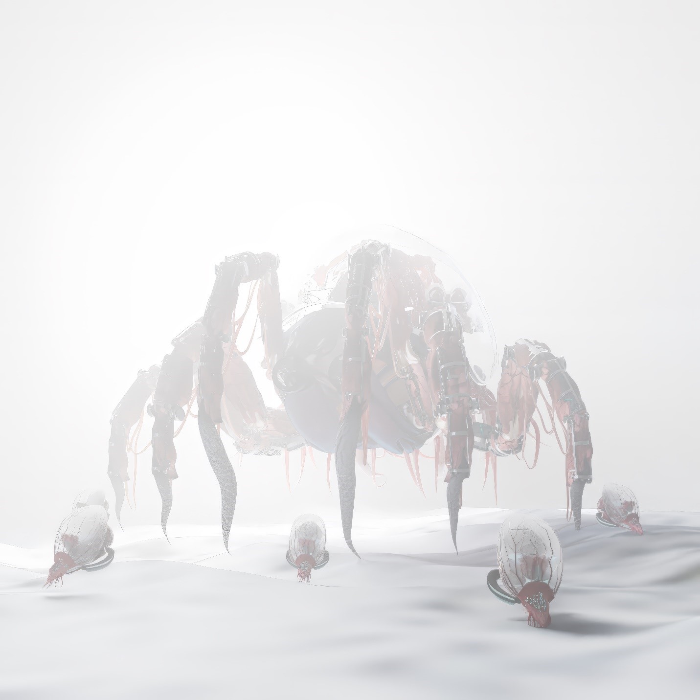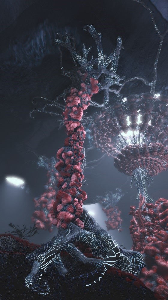 This was the process of texturing, lighting and positioning the camera angles for rendering. The model was computationally aggregated in Grasshopper while also organically modeling in Maya. Adding the atmospheric volumetric fog is a touch that is consistently seen throughout the different chapters. It helps further drive the Eerie theme of the story.