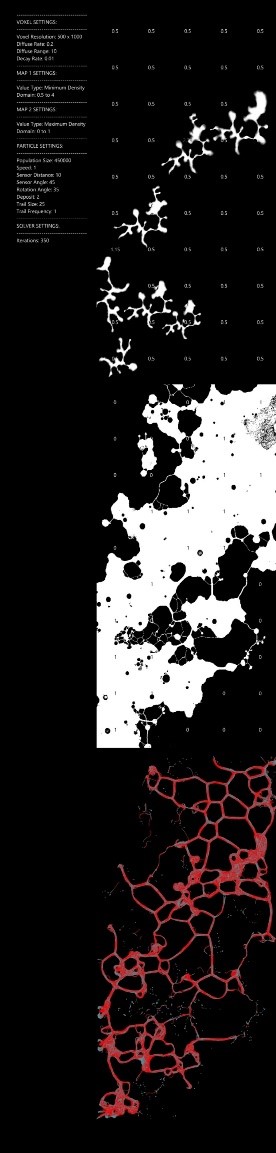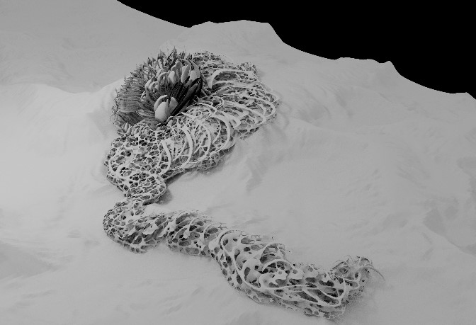 In the depths of our design journey, my team and I crafted eerie aggregations using a blend of organic vision and computational prowess. With tools like Grasshopper and Maya, I built a subterranean empire to showcase the Syphozoan's diverse livable columns, each serving unique functions within this dark realm. Below ground, amidst a floor of molten lava, these columns thrived, while above ground lay a barren, frigid ammonic wasteland where they emerged solely to hunt and capture prey.